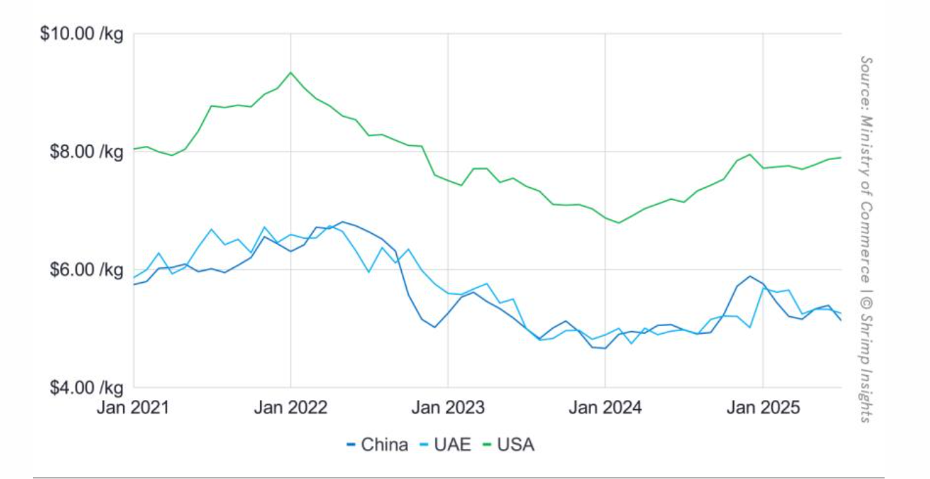 Giá xuất khẩu tôm thẻ nguyên liệu trung bình từ Ấn Độ sang Mỹ, Trung Quốc và UAE từ tháng 1/2021 - 7/2025