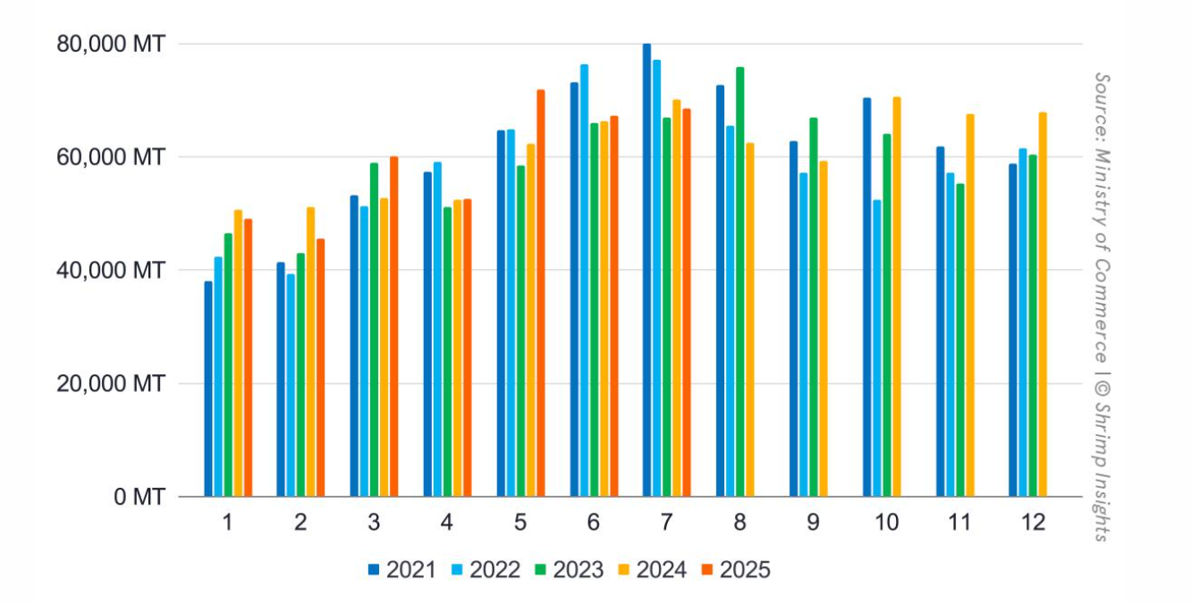 Trong tháng 7/2025, Ấn Độ đã xuất khẩu 68.527 tấn tôm, giảm 2% so với cùng kỳ năm ngoái. Trong 7 tháng đầu năm 2025, xuất khẩu tôm Ấn Độ đạt 414.729 tấn, tăng 2% so với cùng kỳ năm 2024. Giá trị xuất khẩu trong tháng 7 đạt 491 triệu USD, tăng 7% YoY. Tổng giá trị xuất khẩu đạt 2,94 tỷ USD, tăng 12% YoY.