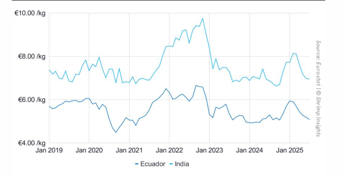 Giá trị nhập khẩu trung bình tôm sú nguyên liệu từ Ấn Độ và Ecuador vào EU từ tháng 1/2019 - 7/2025
