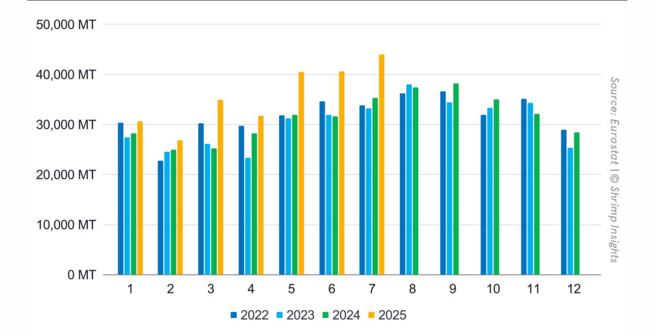 Xét về mặt hàng, nhập khẩu tôm sú đông lạnh nguyên liệu đạt 38.452 tấn trong tháng 7, tăng 26% so với cùng kỳ năm ngoái. Con số này nâng tổng khối lượng nhập khẩu từ tháng 1 đến tháng 7 lên 217.700 tấn, tăng 21% so với cùng kỳ năm ngoái. Nhập khẩu tôm giá trị gia tăng đạt 5.558 tấn trong tháng 7, tăng 14% so với tháng 7 năm 2024, với khối lượng từ đầu năm đến nay đạt 31.602 tấn, cũng tăng 21% so với cùng kỳ năm ngoái.