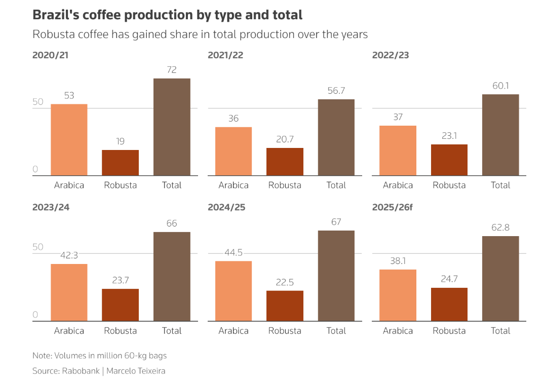 Sản lượng cà phê robusta tại Brazil đã tăng trưởng đều đặn trong những năm gần đây và ước tính sẽ đạt 24,7 triệu bao 60kg vào năm 2025, theo dự báo của Rabobank, tăng từ 19 triệu bao vào năm 2020. Theo Bộ Nông nghiệp Mỹ, Việt Nam dự kiến sẽ sản xuất khoảng 30 triệu bao robusta trong niên vụ 2025/26.