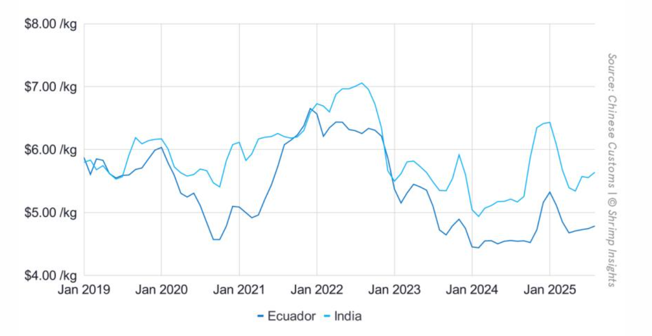 Giá tôm nhập khẩu trung bình từ Ecuador và Ấn Độ vào Trung Quốc từ tháng 1/2021 – 8/2025