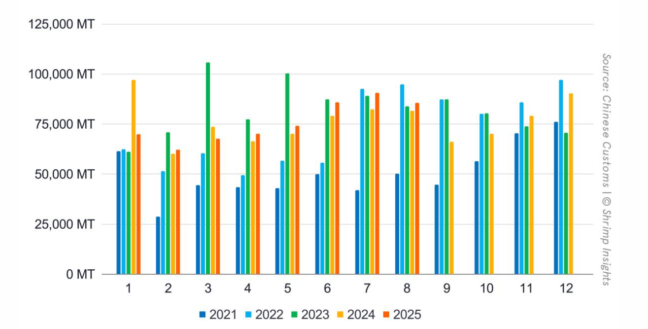 Trung Quốc đã nhập khẩu 69.814 tấn tôm trong tháng 1, giảm 28% so với cùng kỳ năm ngoái. Tháng 2 phục hồi nhẹ với 62.167 tấn (+3% YoY), nhưng tháng 3 lại giảm xuống còn 67.642 tấn (-8% YoY). Nhập khẩu tăng trong tháng 4 với 70.067 tấn (+5% YoY) và đạt mức cao nhất từ đầu năm đến nay vào tháng 7 là 90.683 tấn (+10% YoY). Tiếp theo là tháng 8 với 85.498 tấn (+5% YoY). Lũy kế 8 tháng đầu năm, nhập khẩu đạt 605.868 tấn, giảm nhẹ 1% so với cùng kỳ năm 2024.