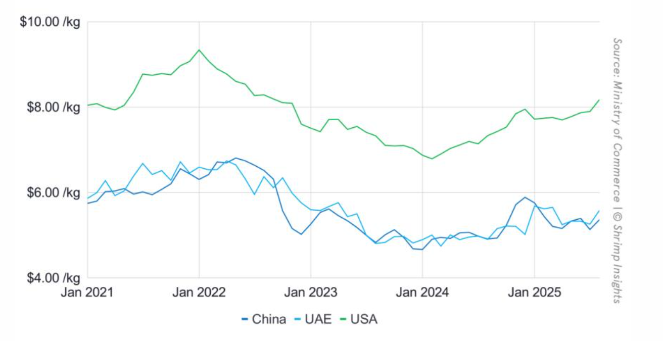 Giá tôm thẻ chân trắng nguyên liệu xuất khẩu trung bình từ Ấn Độ sang Mỹ, Trung Quốc và UAE từ tháng 1/2021 – 8/2025