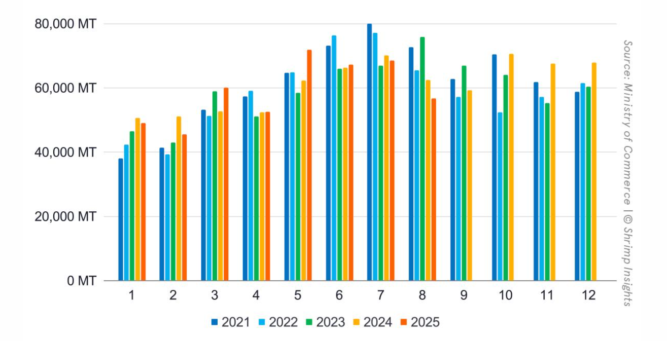 Xuất khẩu tôm Ấn Độ theo tháng từ tháng 1/2021 – 8/2025