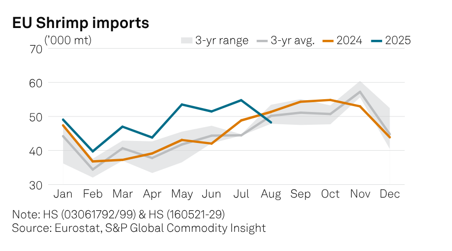 Theo dữ liệu của Eurostat và các bên tham gia thị trường, nhập khẩu tôm của Liên minh Châu Âu đã giảm trong tháng 8/2025 sau nhiều tháng nhập khẩu mạnh, trong đó đồng euro mạnh hơn đã nâng cao sức mua cho người mua. Tổng lượng nhập khẩu của EU đạt khoảng 387.000 tấn trong 8 tháng đầu năm 2025, tăng 12% so với cùng kỳ năm trước, trong khi tổng giá trị nhập khẩu tăng 18% lên 2,84 tỷ USD. Các lô hàng trong tháng 8 giảm 6% so với cùng kỳ năm trước xuống còn 48.245 tấn, báo hiệu sự bình thường hóa trong dòng chảy thương mại sau một thời gian dài tái dự trữ vào đầu năm.
