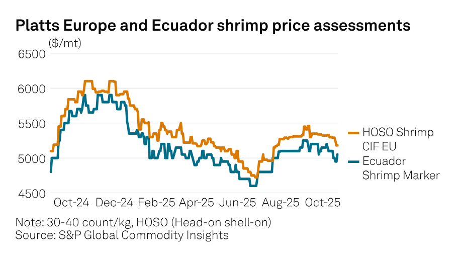 Giá tôm, thường tăng trong giai đoạn thu mua từ tháng 9 đến tháng 10, đã giảm nhẹ trong năm nay do lượng hàng tồn kho cao và nguồn cung thay thế rẻ hơn đã ảnh hưởng đến tâm lý thị trường. Vào ngày 23/10, Platts ghi nhận giá tôm HOSO (giá CIF châu Âu) ở mức 5.200 USD/tấn, giảm so với mức 5.310 USD/tấn vào ngày 28/8. Các nhà nhập khẩu cho biết nhu cầu bán lẻ và dịch vụ thực phẩm trên khắp Bắc Âu và Trung Âu vẫn ổn định đối với các sản phẩm sơ chế như tôm lột vỏ, bỏ chỉ lưng, tôm còn đuôi và các sản phẩm giá trị gia tăng khác. Tuy nhiên, các nhà xuất khẩu dự kiến biên lợi nhuận sẽ tiếp tục bị thu hẹp trong quý IV, do đồng euro mạnh lên và chi phí lưu kho tăng cao, hạn chế khả năng phục hồi giá.
