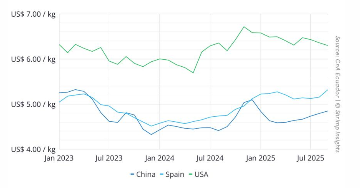 Giá tôm xuất khẩu trung bình từ Ecuador sang Trung Quốc, Hoa Kỳ và Tây Ban Nha từ tháng 1/2023 - 9/2025