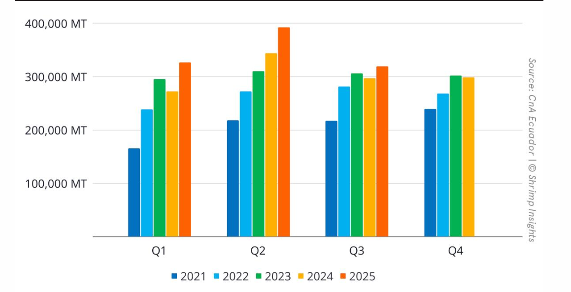 Xuất khẩu tôm Ecuador đạt 104.201 tấn tôm trong tháng 9/2025, tăng 9% YoY. Giá trị xuất khẩu đạt 571 triệu USD, tăng 22% YoY. Trong chín tháng đầu năm 2025, tổng kim ngạch xuất khẩu đạt 1.038.208 tấn, tăng 14% YoY, với tổng giá trị đạt 5,51 tỷ USD, tăng 23% so với cùng kỳ năm 2024.