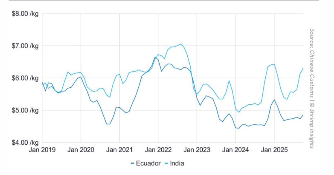 Giá tôm nhập khẩu trung bình từ Ecuador và Ấn Độ vào Trung Quốc từ tháng 1/2021 - 10/2025