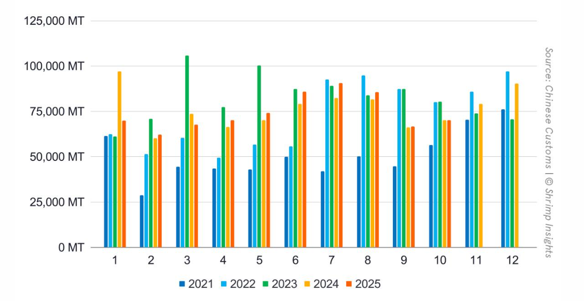 Lượng nhập khẩu tôm hàng tháng của Trung Quốc từ tháng 1/2021 - 10/2025