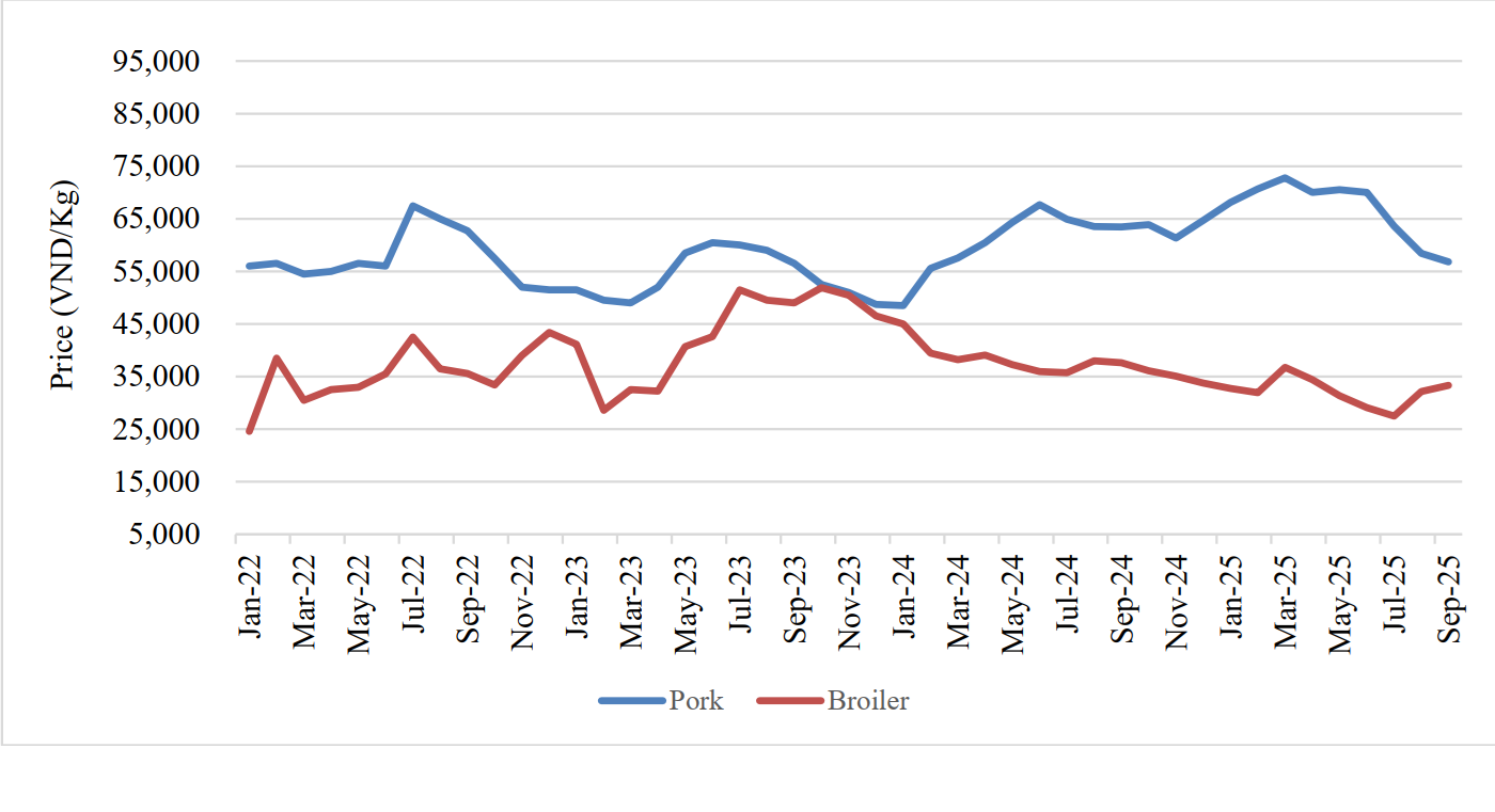 Giá lợn hơi đã giảm kể từ tháng 6, đạt khoảng 56.000 VND/kg vào tháng 8. Theo nguồn tin địa phương, người chăn nuôi nhỏ lẻ có thể đã chịu lỗ khi bán lợn hơi với mức giá này. Bên cạnh chi phí thức ăn chăn nuôi, lợn con và các yêu cầu về môi trường, người chăn nuôi lợn đang phải đối mặt với chi phí tăng cao cho các biện pháp an toàn sinh học để ngăn ngừa dịch tả lợn châu Phi bùng phát. MAE báo cáo rằng khoảng một triệu con lợn đã bị tiêu hủy trong 9 tháng đầu năm 2025 tại 31/34 tỉnh thành. Mặc dù giá thịt lợn hơi tăng dần, nhưng người tiêu dùng đã chuyển sang tiêu thụ gia cầm do lo ngại về khả năng thịt lợn bị nhiễm bệnh và việc tái đàn lợn chậm lại.