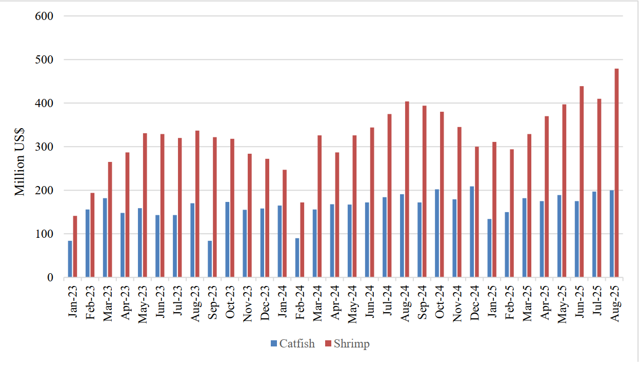 Theo Hiệp hội Chế biến và Xuất khẩu Thủy sản Việt Nam (VASEP), tổng kim ngạch xuất khẩu cá tra và tôm đạt lần lượt khoảng 1,4 tỷ USD và 3 tỷ USD trong 9 tháng đầu năm 2025, tăng 10% và 23% so với cùng kỳ năm ngoái. Tuy nhiên, VASEP dự báo xuất khẩu thủy sản sẽ gặp nhiều thách thức trong những tháng tới, đặc biệt là ở mảng tôm, do bất lợi về cạnh tranh so với các đối thủ chính như Ecuador và Thái Lan.