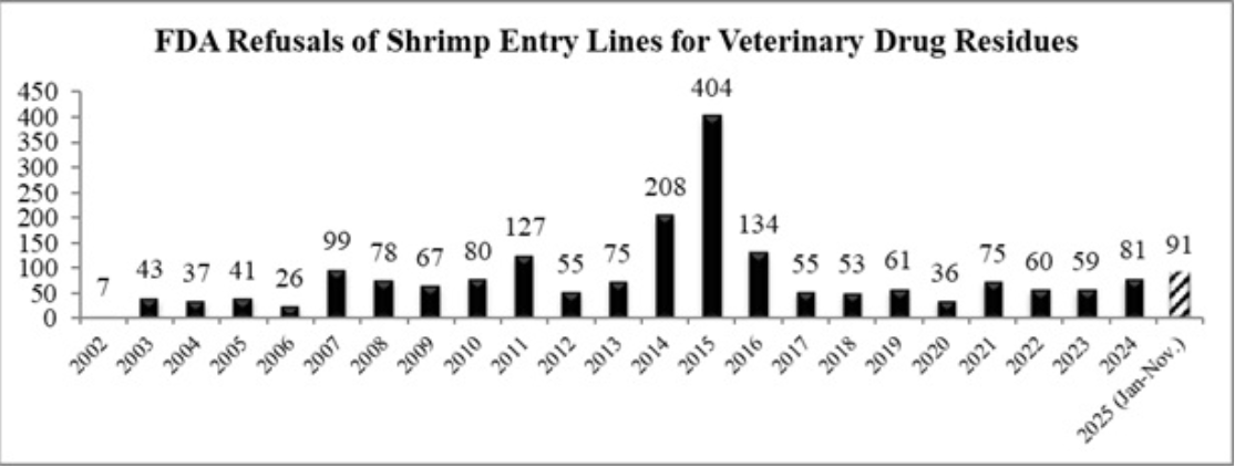 FDA hiện đã báo cáo từ chối tổng cộng 91 lô hàng tôm nhập khẩu vì lý do liên quan đến dư lượng thuốc thú y cho đến tháng 11/2025. Như thể hiện trong biểu đồ bên dưới, đây là tổng số lô hàng tôm bị từ chối nhập khẩu cao thứ sáu liên quan đến dư lượng thuốc thú y trong hai mươi bốn năm qua và là số lô hàng bị FDA từ chối nhiều nhất trong một năm kể từ năm 2016.