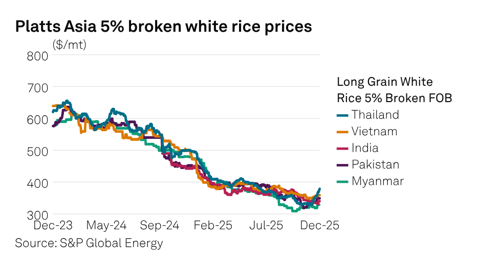 Thái Lan, Việt Nam, Campuchia và Myanmar sẽ bước vào quý 1/2026 với các yếu tố cơ bản trái chiều nhưng phải đối mặt với áp lực cạnh tranh ngày càng tăng từ việc giá gạo Ấn Độ dự báo sẽ giảm. Tại Thái Lan, nguồn cung khan hiếm và giá cao có thể sẽ tiếp tục cho đến khi hàng về vào tháng 2-3. Một nhà cung cấp ở Bangkok cho biết: "Khi vụ mùa mới về, tôi cho rằng giá gạo trắng 5% của Thái Lan sẽ giảm xuống khoảng 340 USD/tấn FOB vào tháng 2, từ mức hiện tại trên 380 USD/tấn", đồng thời cho biết thêm rằng Ấn Độ có thể chiếm ưu thế nếu nguồn cung dư thừa. Các thương nhân Việt Nam dự đoán giá sẽ tăng trừ khi triển vọng nguồn cung của Ấn Độ thay đổi. Gạo trắng sẽ tiếp tục phải cạnh tranh với Ấn Độ, Thái Lan, Pakistan và Myanmar.