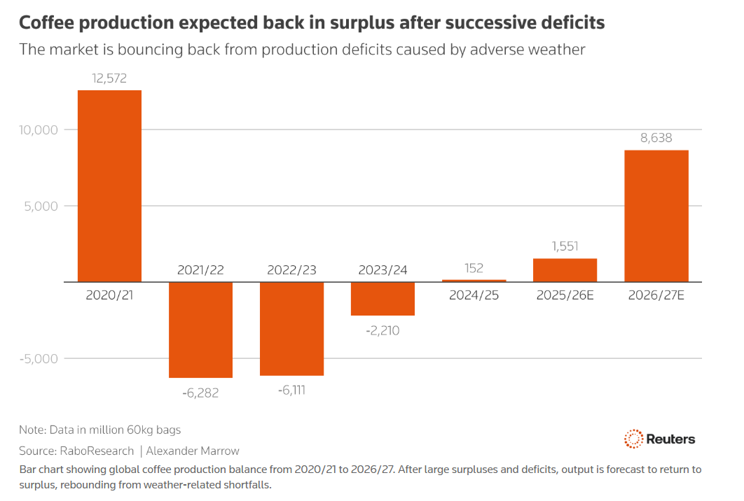 Giá hạt cà phê nguyên liệu chiếm ít nhất 40% chi phí sản xuất một bao cà phê rang xay. Giá đã tăng mạnh vào năm ngoái do thị trường không thể phục hồi sau ba mùa vụ thiếu hụt sản lượng liên quan đến thời tiết bất lợi. Hầu hết các chuyên gia trong ngành dự đoán sẽ có dư thừa sản lượng cà phê trong các mùa vụ hiện tại và sắp tới 2025/26 và 2026/27 từ tháng 10 đến tháng 9, cùng với việc loại bỏ thuế quan, sẽ làm giảm giá hạt cà phê nguyên liệu và cuối cùng sẽ tác động đến người tiêu dùng Mỹ.