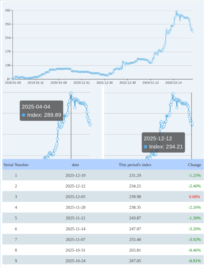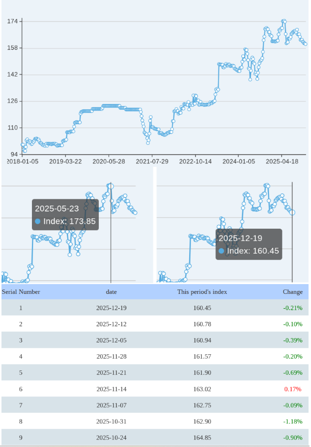 Dữ liệu gần đây do Công ty TNHH Trung tâm Thương mại Nông sản Quốc tế Chiết Giang Chu Sơn công bố cho thấy chỉ số giá hàng tháng của mực biển Trung Quốc đã đóng cửa ở mức 234,21 điểm vào tháng 12 năm 2025. Điều này thể hiện mức giảm đáng kể 23,77% so với mức đỉnh 289,89 điểm vào tháng 4.