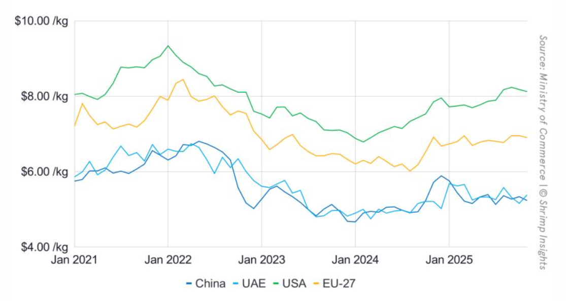 Giá xuất khẩu tôm thẻ trung bình từ Ấn Độ sang EU, Mỹ, UAE và Trung Quốc từ tháng 1/2021 - 11/2025
