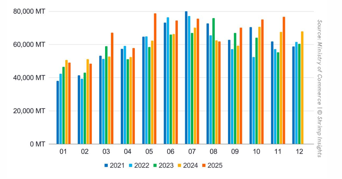 Sản lượng tháng 10 và tháng 11 vẫn ổn định ở mức 75.085 tấn (+6% ) và 76.616 tấn (+13% ) tương ứng, cho thấy nhu cầu giảm từ Mỹ phần lớn đã được hấp thụ bởi các thị trường thay thế, giữ cho tổng xuất khẩu tiếp tục tăng trưởng đến cuối năm. Điều quan trọng cần lưu ý là, với sự chuyển dịch từ thị trường tôm đã bóc vỏ của Mỹ sang thị trường tôm nguyên vỏ (HLSO) ở Trung Quốc và Việt Nam, một phần sự gia tăng khối lượng xuất khẩu có thể là do sự thay đổi trong cơ cấu sản phẩm hơn là do sự gia tăng về trọng lượng tương đương của tôm sống.