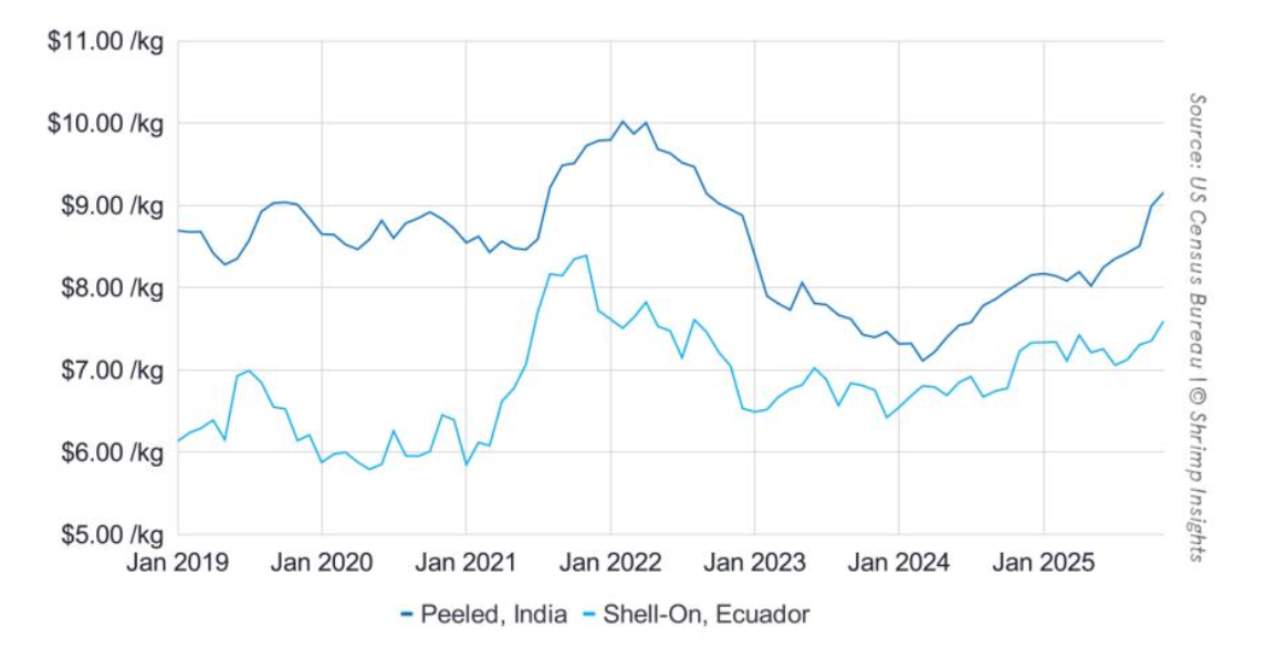 Giá tôm nhập khẩu trung bình từ Ecuador và Ấn Độ vào Mỹ từ tháng 1/2019 - 11/2025