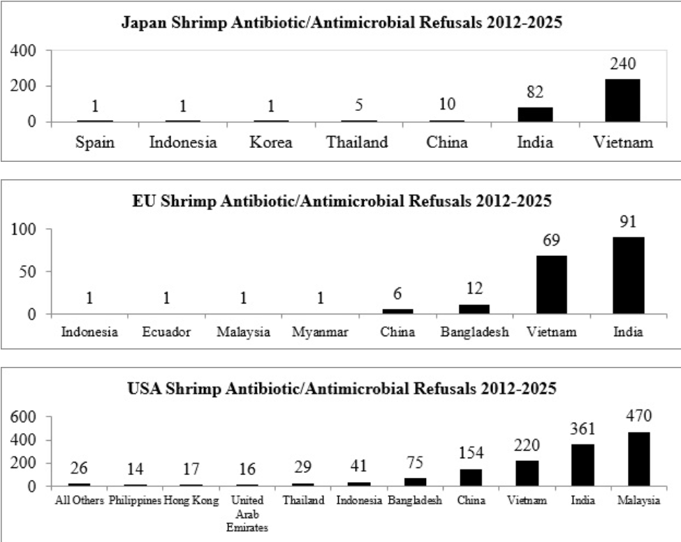Cơ sở dữ liệu về các lô hàng tôm bị từ chối nhập cảnh của Cục Quản lý Thực phẩm và Dược phẩm Mỹ (FDA) tổng hợp thông tin về mọi lô hàng tôm bị từ chối nhập cảnh vì lý do liên quan đến kháng sinh bị cấm từ năm 2002 đến năm 2025. Năm 2025, FDA đã từ chối 93 lô hàng tôm nhập cảnh vì kháng sinh, nhiều nhất kể từ năm 2016. Phần lớn các lô hàng bị từ chối này liên quan đến tôm xuất khẩu từ Ấn Độ (32), Indonesia (30) và Việt Nam (14). Mười bảy (17) dòng nhập khẩu tôm còn lại bị FDA từ chối do sử dụng kháng sinh bị cấm vào năm 2025 là tôm xuất khẩu từ Trung Quốc (8), Malaysia (6), Bangladesh (1), Thái Lan (1) và Hồng Kông (1).