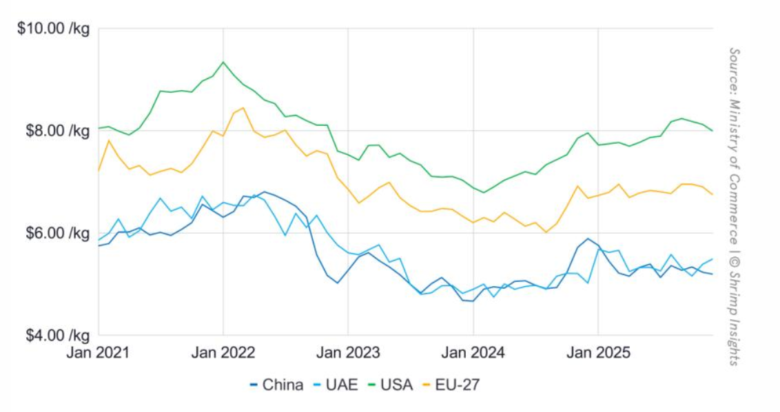 Giá xuất khẩu tôm thẻ trung bình từ Ấn Độ sang EU, Mỹ, UAE và Trung Quốc từ tháng 1/2021 – 12/2025