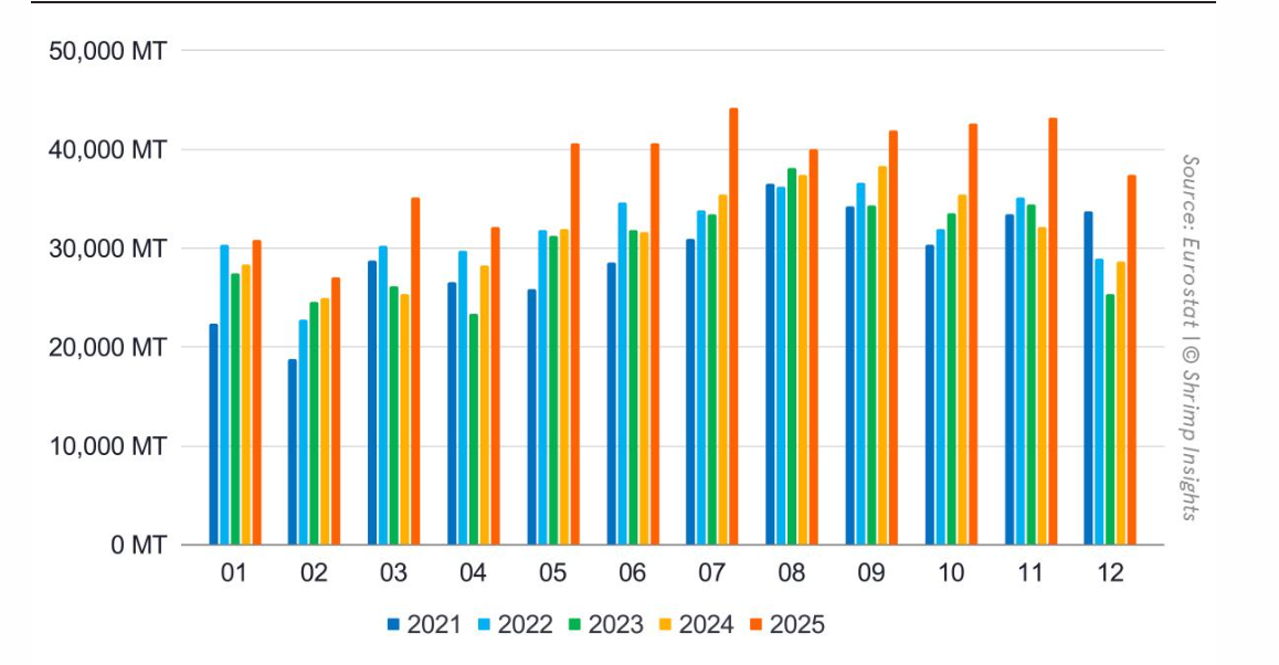 Ecuador củng cố vị trí dẫn đầu, Ấn Độ nhanh chóng mở rộng phạm vi hoạt động—đặc biệt là trong những tháng cuối năm—và Tây Bắc Âu nổi lên như một động lực chính cho sự tăng trưởng cuối năm. Tháng 12 xác nhận rằng nhu cầu của EU vẫn ổn định cho đến cuối năm, một lần nữa định vị khối này là một thị trường tăng trưởng quan trọng về mặt cấu trúc đối với các nhà xuất khẩu tôm toàn cầu.