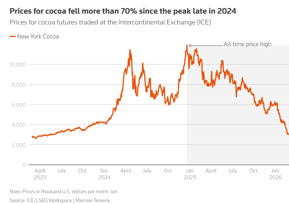Nông dân trồng cacao ở Brazil đã tạm dừng các dự án trồng trọt mới sau khi giá cacao giảm 70% so với mức cao kỷ lục năm 2024, làm đình trệ sự tăng trưởng mà các nhà đầu tư kỳ vọng sẽ biến quốc gia này thành nhà cung cấp chính nguyên liệu chính trong sản xuất sô cô la. Với giá hiện tại khoảng 3.000 USD/tấn, nông dân và các nhà phân tích cho biết họ dự kiến khoảng một nửa số dự án trồng ca cao quy mô công nghiệp ở Brazil có thể bị hủy bỏ.