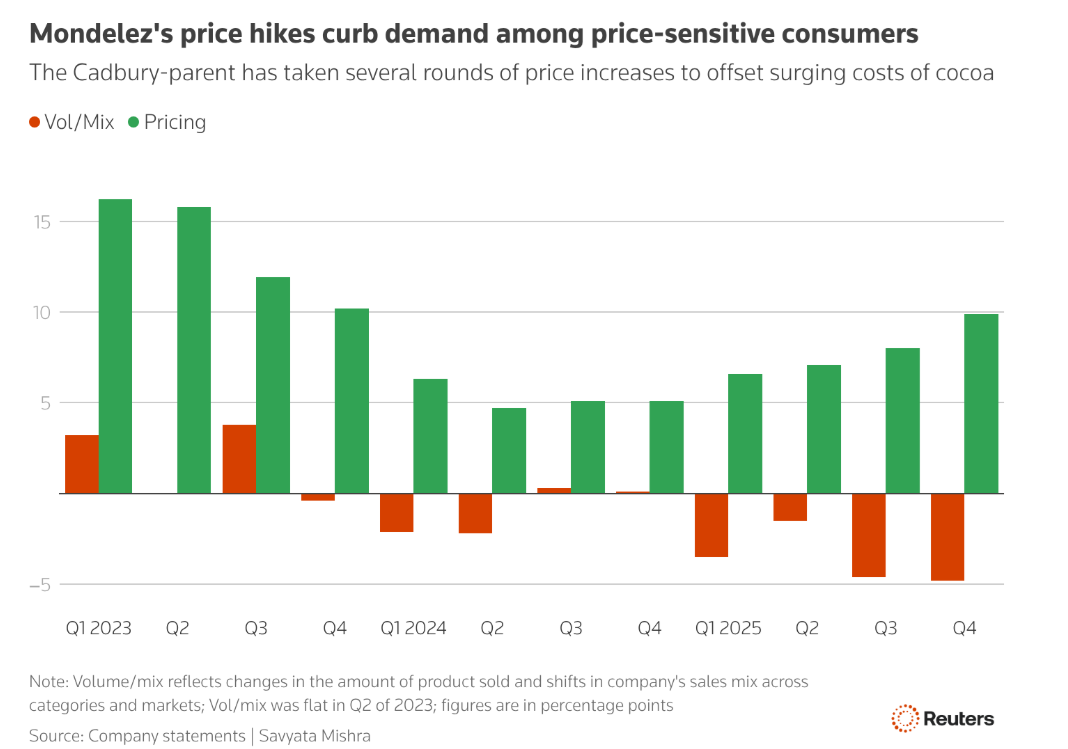 Công ty mẹ của Cadbury, Mondelez, đã thực hiện nhiều đợt tăng giá để bù đắp chi phí ca cao tăng vọt, từ đó làm giảm nhu cầu.