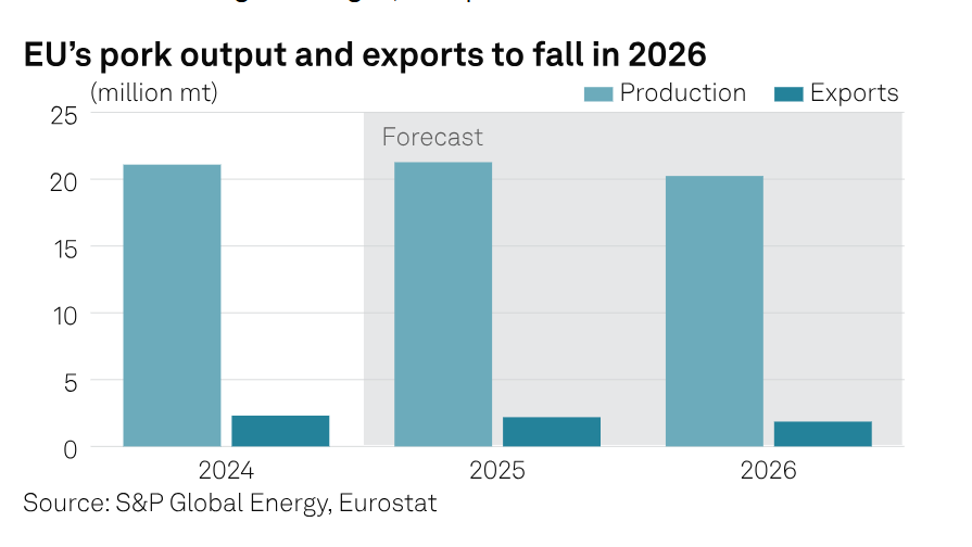 Theo báo cáo bán niên của Cơ quan Dịch vụ Nông nghiệp Nước ngoài thuộc Bộ Nông nghiệp Mỹ (USDA), xuất khẩu thịt lợn của EU dự kiến ​​sẽ giảm xuống còn 2,75 triệu tấn trọng lượng tương đương thịt lợn (CWE) vào năm 2026, từ 3,03 triệu tấn vào năm 2025, do các hạn chế liên quan đến dịch tả lợn châu Phi đối với thịt lợn Tây Ban Nha, thuế quan của Trung Quốc đối với một số nguồn cung của EU và biên lợi nhuận trang trại yếu hơn buộc ngành chăn nuôi lợn của khối phải tái cấu trúc.