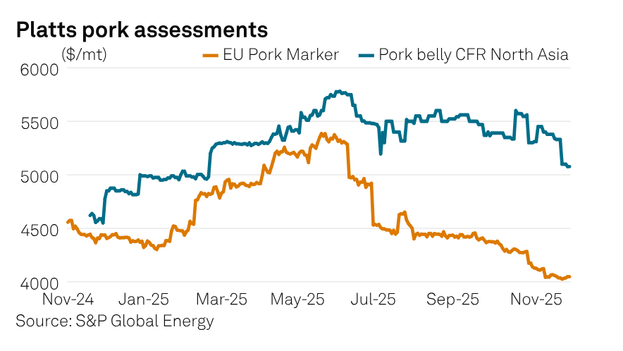 Xuất khẩu thịt lợn của EU chịu áp lực vào đầu năm 2026 sau khi Trung Quốc áp thuế nhập khẩu lên tới 19,8% trong 5 năm tới, trong khi dự kiến ​​sự cạnh tranh ngày càng tăng từ Brazil trên thị trường thịt toàn cầu. Platts, một phần của S&P Global Energy, ghi nhận giá thịt ba chỉ lợn CFR Bắc Á ổn định ở mức 4.600 USD/tấn vào ngày 13/3, không thay đổi so với ngày 12/3, và không có thông tin nào cho thấy giá cả thay đổi.