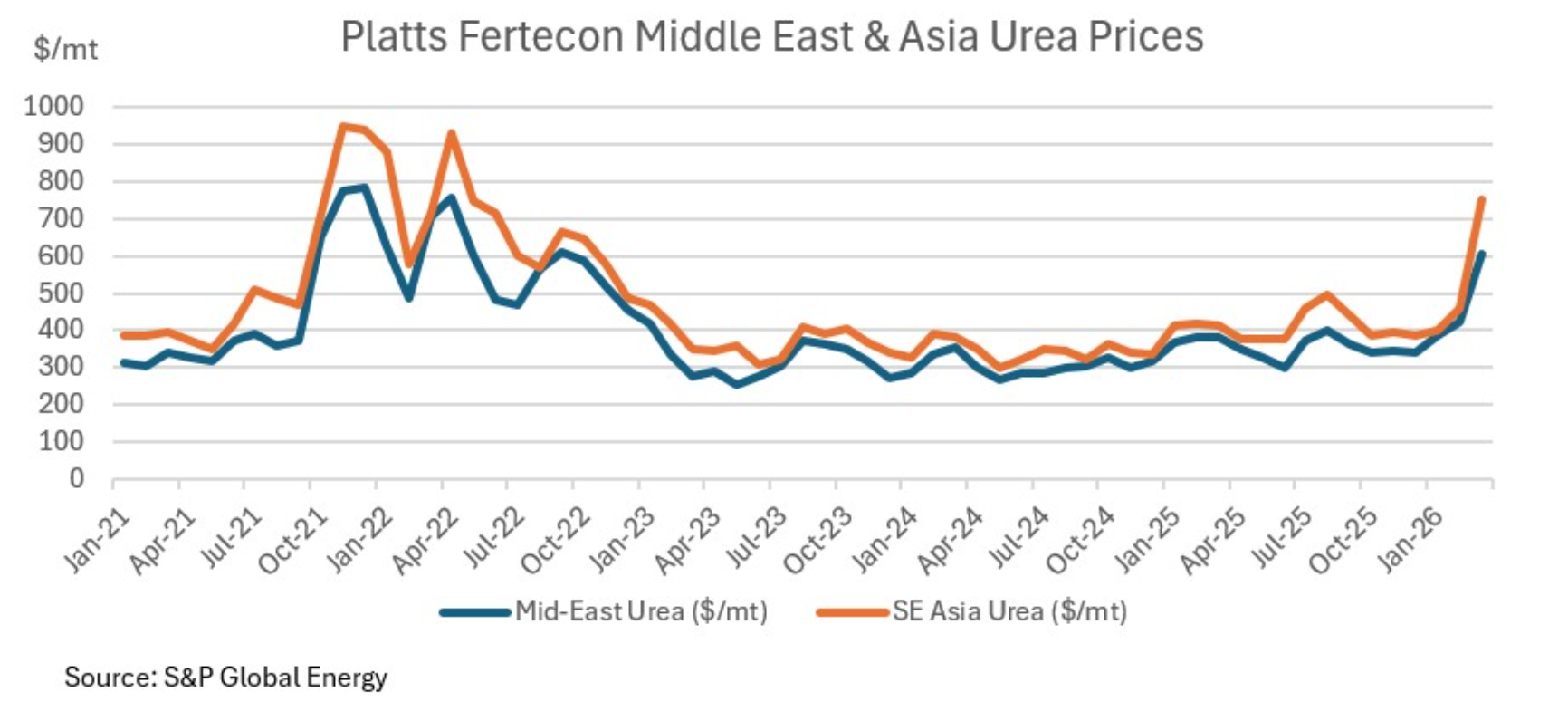 Kể từ cuối tháng 2/2026, gián đoạn vận chuyển tại eo biển Hormuz đã khiến giá nitơ và phốt phát tăng vọt. Đặc biệt, giá phân bón nitơ đã tăng mạnh trên toàn cầu. Platts ghi nhận giá giá urê dạng hạt FOB Trung Đông ở mức 604-710 USD/tấn vào ngày 19/3, một bước nhảy vọt mạnh so với mức 436-494 USD/tấn vào ngày 26/2 trước khi cuộc xung đột bắt đầu. Giá urê dạng hạt tại Đông Nam Á đạt 750 USD/tấn FOB vào ngày 19/3, tăng từ mức 490-498 USD/tấn trước xung đột. Mặc dù vẫn chịu áp lực tăng, giá này thấp hơn mức cao nhất của năm 2022, và mức tăng này đưa giá vượt xa mức giá ghi nhận từ năm 2023.