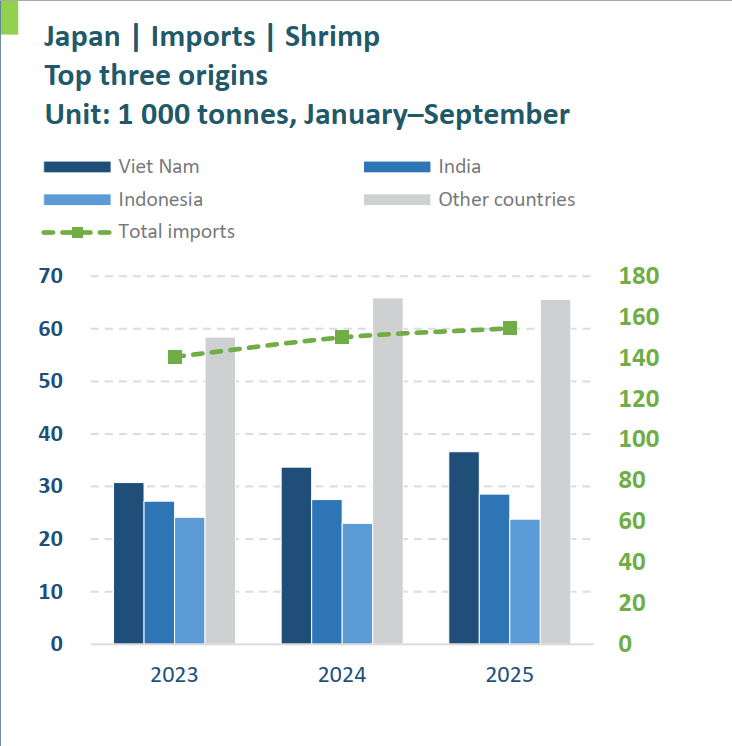 Nhập khẩu nguyên liệu đông lạnh để chế biến tái xuất tăng ở Việt Nam và Thái Lan trong nửa cuối năm 2025. Việt Nam, một nhà sản xuất và xuất khẩu tôm chế biến lớn, đã nhập khẩu 85.000 tấn tôm đông lạnh nguyên liệu trong năm 2025 (+50% so với năm trước) để bổ sung nguồn cung trong nước. Ấn Độ là nhà cung cấp chính cho Việt Nam với 62.200 tấn, tiếp theo là Ecuador với 12.000 tấn.