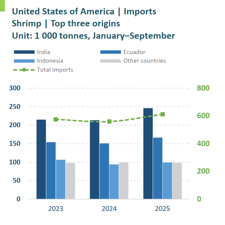 Mặc dù thuế quan tăng cao tại Mỹ và nhập khẩu tôm giảm tại Trung Quốc, tổng lượng xuất khẩu tôm toàn cầu đạt 2,93 triệu tấn và giá trị 21,62 tỷ USD trong 9 tháng đầu năm 2025, tăng hơn 4,5% về lượng và 12% về giá trị so với cùng kỳ năm 2024. Hai nước xuất khẩu hàng đầu, Ecuador và Ấn Độ, đều có mức tăng trưởng hai chữ số cả về khối lượng và giá trị; doanh thu xuất khẩu của họ tăng lần lượt 19% so với cùng kỳ năm ngoái, đạt 6,24 tỷ USD và 17,14%, đạt 4,15 tỷ USD trong 9 tháng đầu năm 2025.