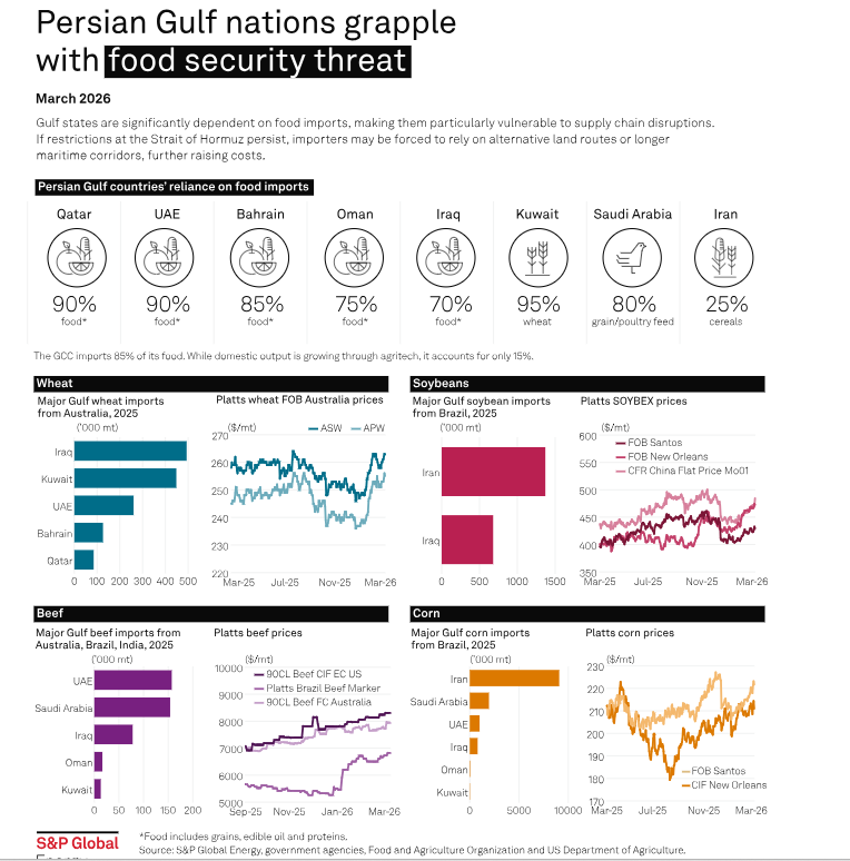 - Các quốc gia vùng Vịnh phụ thuộc vào các nhà xuất khẩu thực phẩm, bao gồm Úc, Nga, Brazil và Ukraine, để đáp ứng nhu cầu của họ, chẳng hạn như lúa mì, ngô, thịt bò và gia cầm.