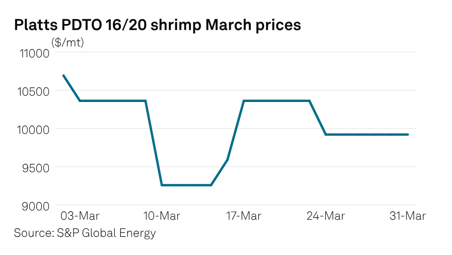 Giá tôm của Mỹ giảm trong suốt tháng 3, từ 4,85 USD/pound CIF New York vào ngày 2/3 xuống mức thấp nhất trong tháng là 4,20 USD/pound vào ngày 10-12/3, trước khi phục hồi lên 4,70 USD/pound vào giữa tháng và sau đó giảm trở lại xuống 4,50 USD/pound vào ngày 24/3, và duy trì ở mức này cho đến cuối tháng.
