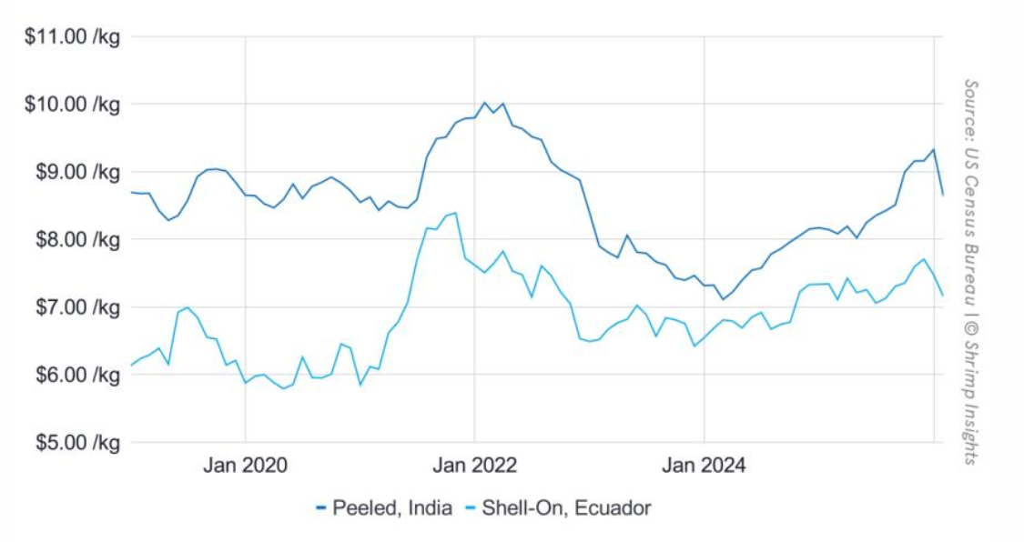 Giá tôm nhập khẩu trung bình từ Ecuador và Ấn Độ sang Mỹ từ tháng 1/2019 – tháng 2/2026