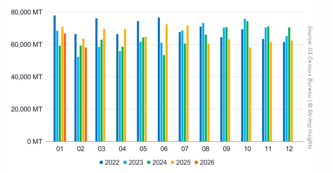 Nhập khẩu tôm hàng tháng của Mỹ từ tháng 1/2022 – 2/2026