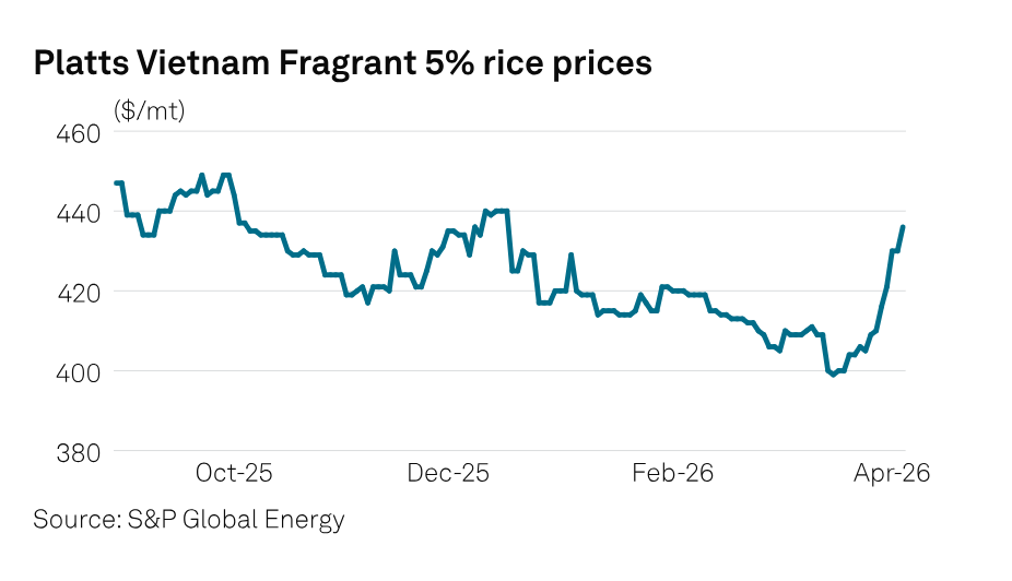 Giá gạo thơm Việt Nam đã tăng lên mức cao nhất trong gần 4 tháng do các nhà xuất khẩu trì hoãn chào hang để ưu tiên các hợp đồng hiện có và bổ sung hàng tồn kho trong bối cảnh chi phí sản xuất tăng cao, các nguồn tin thị trường cho biết với Platts, thuộc S&P Global Energy, ngày 7/4. Platts ghi nhận giá gạo thơm 5% của Việt Nam ở mức 436 USD/tấn FOB vào ngày 6/4, tăng 1,4% so với ngày hôm trước và 6,6% so với tháng trước, đánh dấu mức cao nhất kể từ ngày 16/12, khi giá được định giá ở mức 440 USD/tấn FOB.