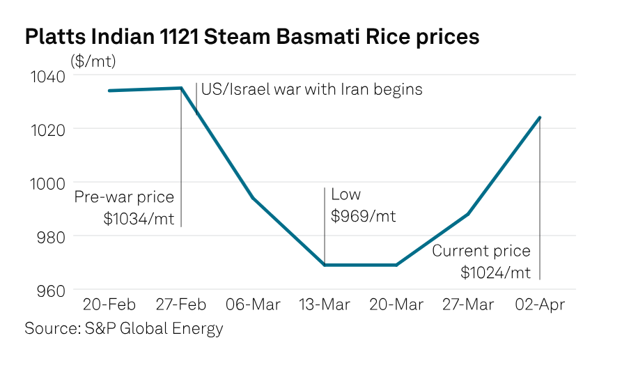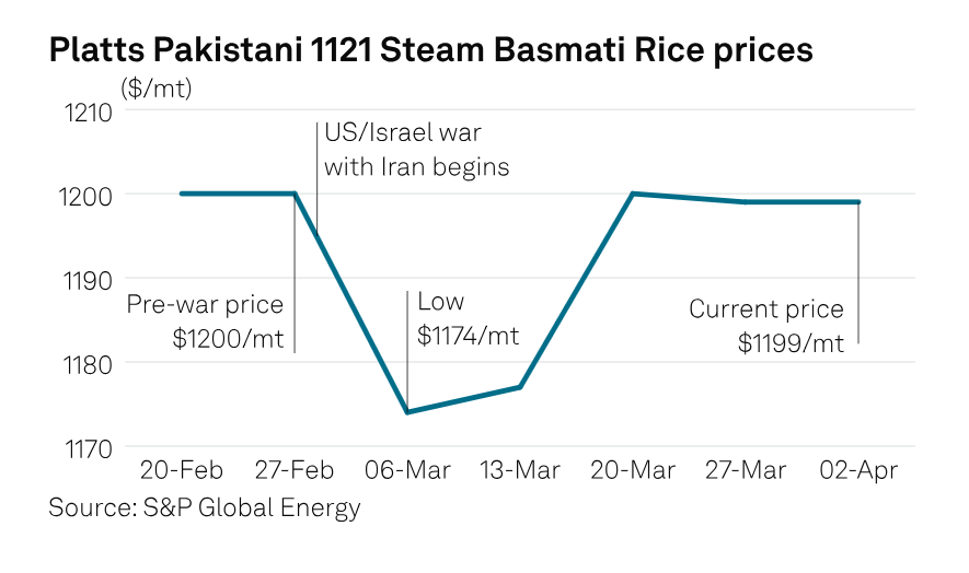 Sau khi chiến tranh bùng nổ vào cuối tháng 2, giá gạo basmati ban đầu giảm nhưng nhanh chóng bắt đầu tăng từ cả hai nước xuất khẩu này. Xu hướng tăng này được thúc đẩy bởi sự biến động về cước vận chuyển, sự bất ổn ngày càng tăng và nhu cầu ngày càng tăng từ Trung Đông khi người mua cạn kiệt hàng tồn kho của họ. Chi phí nhiên liệu, vận chuyển và vật liệu đóng gói tăng cao trong bối cảnh nguồn cung container khan hiếm cũng duy trì đà tăng giá, điều này vẫn tiếp diễn ngay cả sau khi lệnh ngừng bắn tạm thời được công bố. Giá gạo Basmati 1121 của Ấn Độ đã giảm sau khi chiến tranh bùng nổ vào ngày 28/2, từ 1.035 USD/tấn FOB ngày 27/2 xuống mức thấp nhất là 969 USD/tấn FOB vào tháng 3, nhưng đã phục hồi khi nhu cầu và sự biến động về cước vận chuyển tăng lên, đạt 1.024 USD/tấn FOB vào ngày 2/4, tăng 55 USD/tấn so với tuần trước, và sau đó là thông báo về lệnh ngừng bắn vào ngày 8/4, theo dữ liệu của Platts.