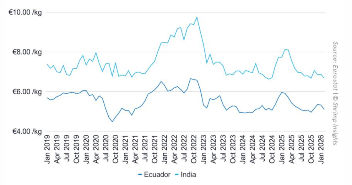 Giá tôm sú nguyên liệu nhập khẩu trung bình từ Ấn Độ và Ecuador vào EU từ tháng 1/2019 – 2/2026