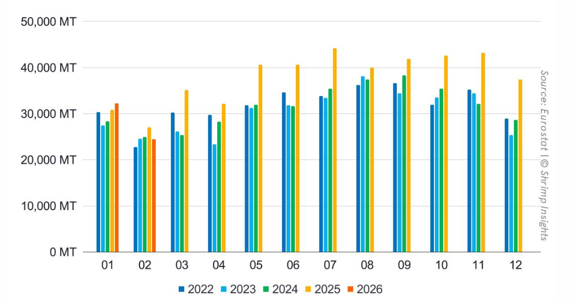 Nhập khẩu tôm của EU khởi đầu năm 2026 giảm nhẹ do suy giảm nhập khẩu trong tháng 2