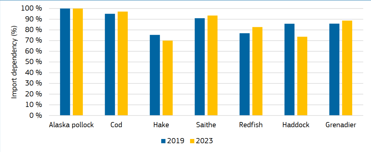Hình 3: Mức độ phụ thuộc vào nhập khẩu của EU đối với các loài cá đáy tự nhiên chủ yếu trong năm 2019 và 2023