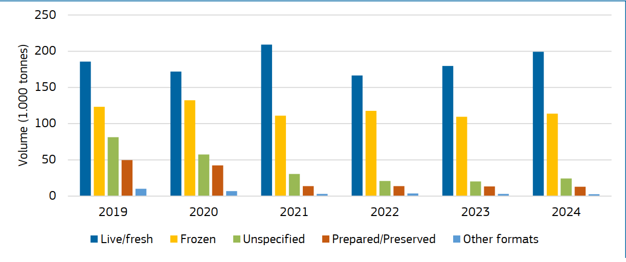 Đối với các mặt hàng thực phẩm thủy sản, sự phụ thuộc nhập khẩu cao của EU - khoảng 65% - vẫn là đặc điểm nổi bật của thị trường. Lạm phát và sự bất ổn của chuỗi cung ứng đã thúc đẩy sự chuyển dịch từ sản phẩm tươi sống sang sản phẩm đông lạnh và mở rộng vai trò của các kênh bán lẻ và trực tuyến. Các loài bị ảnh hưởng khác nhau: nhu cầu cá hồi vẫn mạnh nhưng ngày càng bị hạn chế về giá; các loài nuôi trồng thủy sản Địa Trung Hải như cá vược và cá tráp biển đã trải qua sự sụt giảm mạnh về tiêu thụ trong giai đoạn 2022-2024; cá tuyết phải đối mặt với tình trạng thiếu hụt nguồn cung kéo dài và giá nhập khẩu cao; và động vật có vỏ tươi sống chịu ảnh hưởng nặng nề nhất trong giai đoạn đầu của đại dịch do phụ thuộc vào dịch vụ ăn uống. Các trung tâm chế biến – đặc biệt là Ba Lan, Hà Lan, Đức và Tây Ban Nha – đã hấp thụ được những cú sốc về nguyên liệu thô nhưng lại bị ảnh hưởng nặng nề bởi chi phí năng lượng và hậu cần tăng cao.