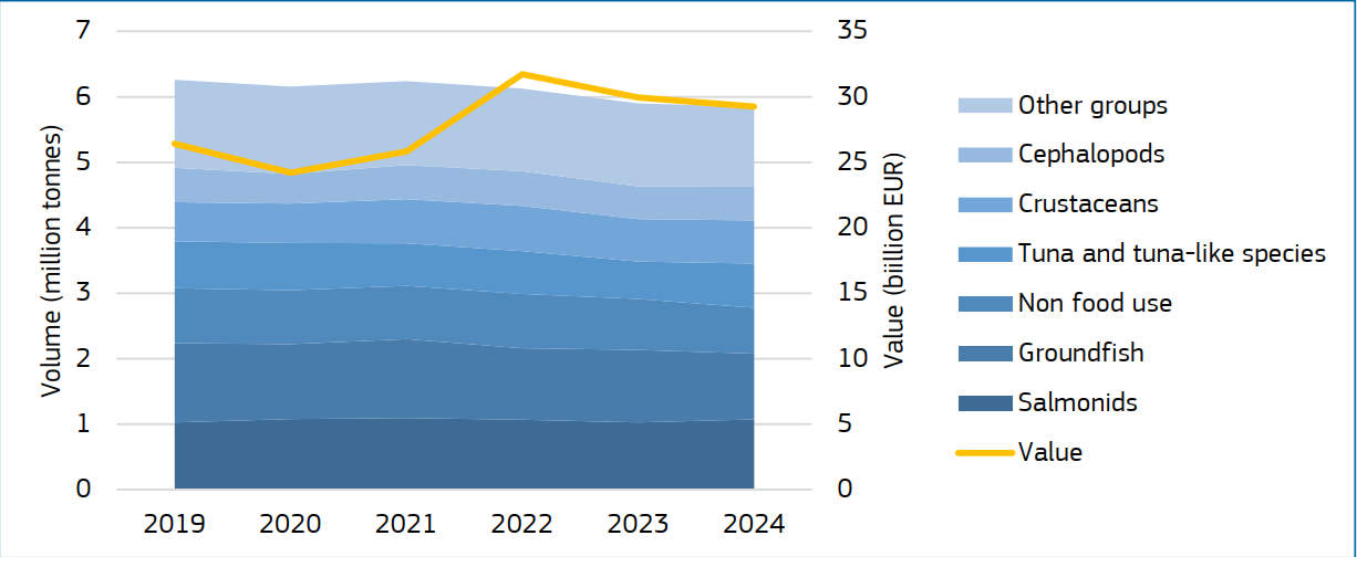 Về phía khai thác thủy sản, các loài cá chính được đánh bắt bởi đội tàu EU bao gồm cá trích, cá tuyết xanh, cá thu, cá tuyết chấm đen, cá mòi và cá ngừ. Tổng sản lượng đánh bắt của EU đạt 2,9 triệu tấn vào năm 2023, mức thấp nhất trong thập kỷ qua, sau một thời gian dài suy giảm kể từ năm 2018. Mặc dù sản lượng giảm, sản lượng đánh bắt vẫn là yếu tố đầu vào quan trọng đối với các ngành công nghiệp chế biến của EU và nền kinh tế khu vực. Với quy mô thị trường thực phẩm thủy sản của EU, sản xuất trong nước không đủ để đáp ứng nhu cầu. EU vẫn phụ thuộc vào nhập khẩu, đặc biệt là cá ngừ, cá hồi, cá minh thái Alaska, tôm và cá tuyết, chiếm 44% tổng lượng tiêu thụ ước tính năm 2023, với tỷ lệ tự cung tự cấp chỉ 12% đối với các sản phẩm này. Trên tất cả các nhóm hàng hóa, tỷ lệ tự cung tự cấp của EU đạt 38% vào năm 2023, tăng nhẹ so với mức thấp nhất trong thập kỷ được ghi nhận vào năm 2022 nhưng vẫn thấp hơn nhiều so với những năm trước do sản lượng trong nước giảm kể từ năm 2018.