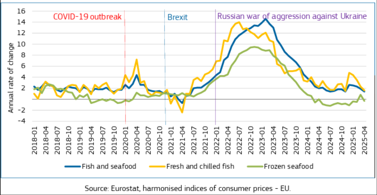 COVID-19 đã gây ra sự sụp đổ đột ngột về nhu cầu dịch vụ ăn uống và những gián đoạn lớn về hậu cần và lao động, dẫn đến sự sụt giảm mạnh doanh số bán các sản phẩm thủy sản tươi sống, có giá trị cao. Tuy nhiên, tiêu thụ bán lẻ lại tăng lên khi các hộ gia đình chuyển sang sử dụng các sản phẩm đông lạnh, đóng hộp và chế biến sẵn. Sau đó, Brexit đã đưa ra các rào cản phi thuế quan mới – thủ tục hải quan, kiểm soát vệ sinh và kiểm dịch thực vật, và sự chậm trễ tại biên giới – làm tăng chi phí và gây khó khăn cho việc vận chuyển các sản phẩm tươi sống giữa EU và Vương quốc Anh. Điều này buộc nhiều nhà khai thác phải điều chỉnh tuyến đường thương mại, đa dạng hóa nguồn cung và phụ thuộc nhiều hơn vào các sản phẩm đông lạnh. Cuộc chiến tranh xâm lược của Nga tại Ukraine đã làm gia tăng áp lực thông qua đẩy giá năng lượng, nhiên liệu, thức ăn chăn nuôi và phân bón lên cao, làm tăng đáng kể chi phí hoạt động cho cả ngành đánh bắt và nuôi trồng thủy sản. Những cú sốc chi phí này đã dẫn đến giá tiêu dùng cao hơn trên hầu hết các loại hải sản, góp phần làm giảm nhu cầu về khối lượng sau năm 2021 khi các hộ gia đình trở nên nhạy cảm hơn về giá cả.