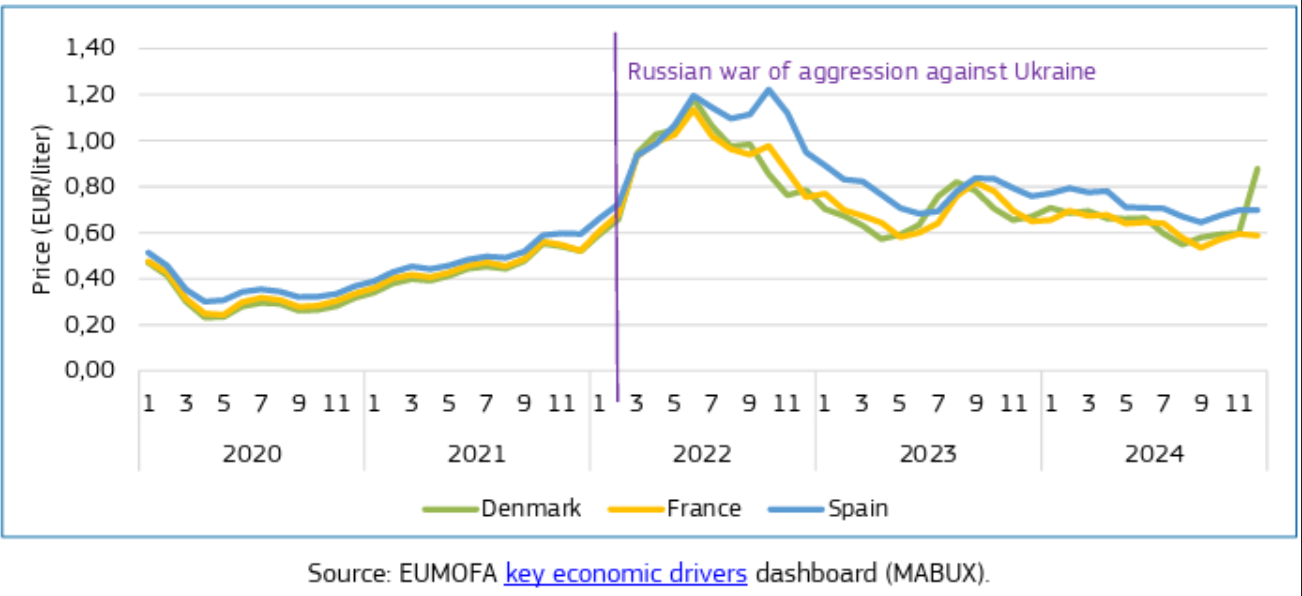 Cuộc chiến tranh xâm lược Ukraine của Nga năm 2022 đã gây ra cú sốc thứ ba với những tác động gián tiếp sâu rộng đến ngành thủy sản và nuôi trồng thủy sản của EU. Sự tăng mạnh giá năng lượng đã làm tăng chi phí hoạt động cho tàu đánh cá, các cơ sở nuôi trồng thủy sản, nhà máy chế biến, kho lạnh và vận chuyển (Hình 2). Đồng thời, sự gián đoạn trên thị trường hàng hóa toàn cầu và logistics đã góp phần làm tăng giá các nguyên liệu đầu vào quan trọng cho thức ăn nuôi trồng thủy sản, bao bì và các nguyên liệu thô thiết yếu. Những áp lực chi phí này đã thúc đẩy động lực lạm phát rộng hơn, làm suy yếu sức mua của hộ gia đình và củng cố sự dịch chuyển trong tiêu dùng sang các sản phẩm thực phẩm thủy sản có giá thấp hơn và thời hạn sử dụng lâu hơn.